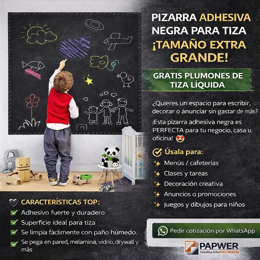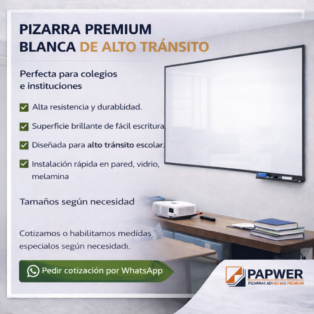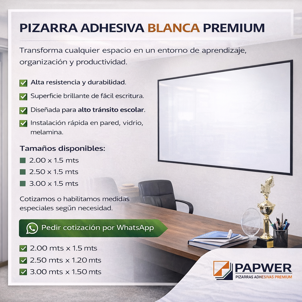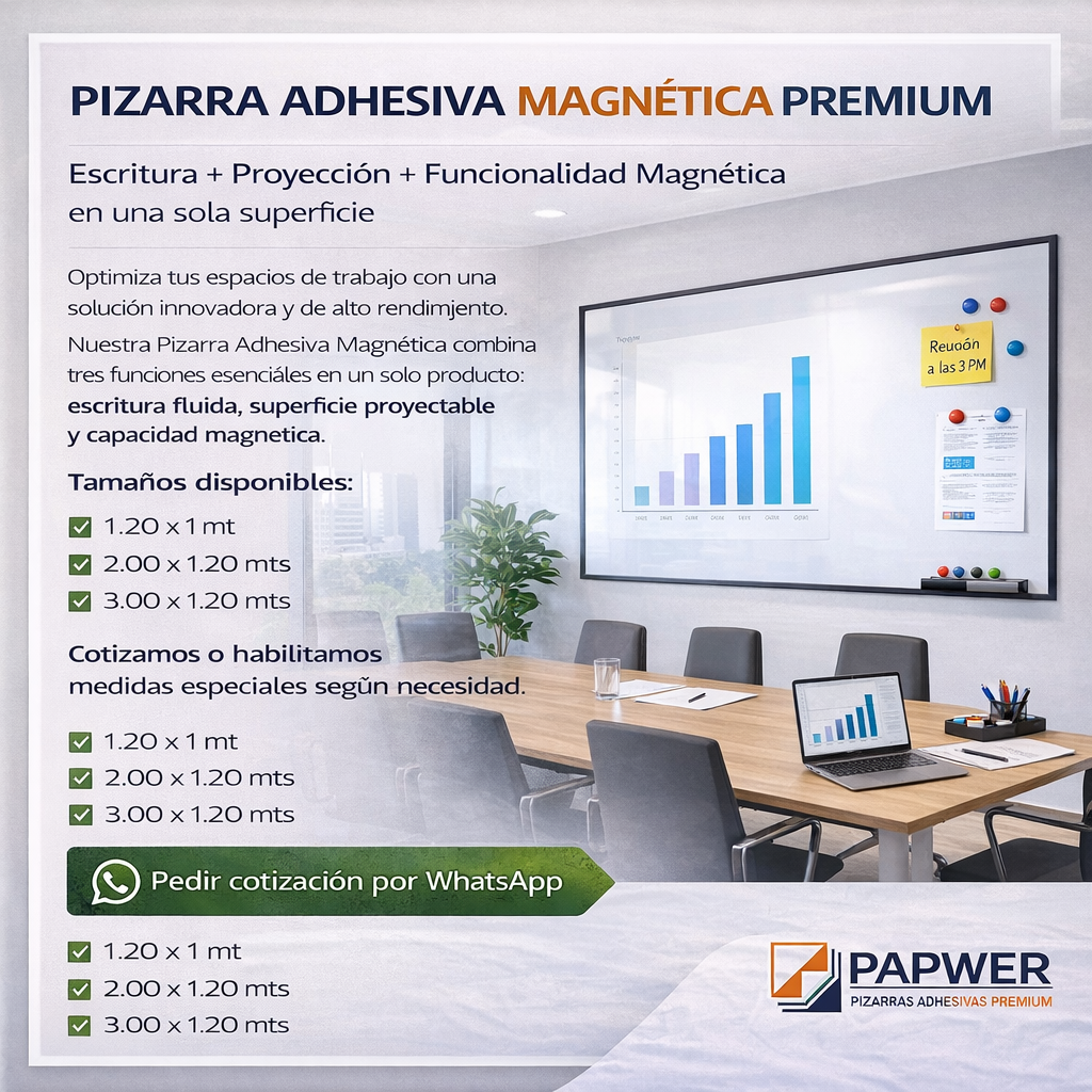 En PAPWER Pizarras Adhesivas Premium ofrecemos soluciones modernas para transformar cualquier superficie en una pizarra funcional, práctica y elegante. Nuestras pizarras adhesivas blancas y magnéticas de vinil premium están diseñadas para empresas, oficinas, colegios, instituciones educativas y hogares, permitiendo crear espacios de trabajo colaborativo, organización y aprendizaje.